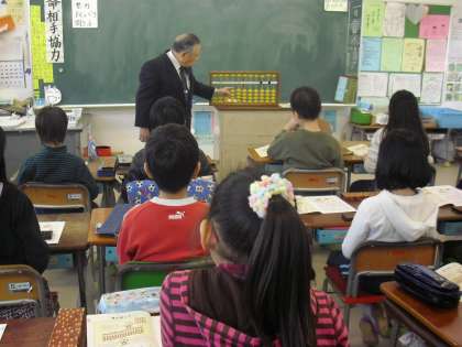 3年生の算数の授業の様子です。全国珠算教育連盟から講師の先生をお招きし、そろばんの学習をしているところです。そろばんの部分の名前、見方、数の数え方等の基本的なところから学びました。「パチ」「パチ」という音とともにゆっくりと計算の練習をしました。