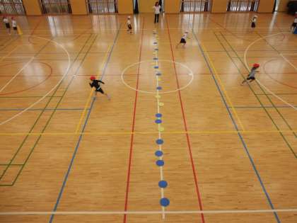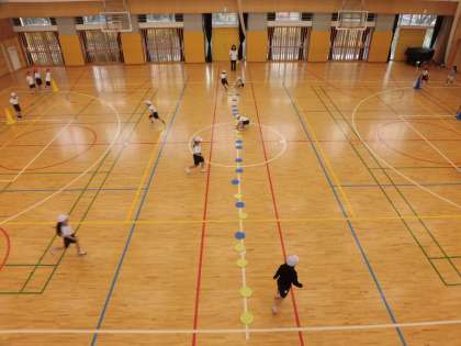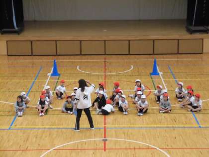 12日(水)の5時間目、1年4組は体育の時間でした。体育館でなわとび練習をしてから、「オセロ競争」をしました。体育館の中央に片面が青色、もう片面が黄色の円が並べられました。左右に分かれた子どもたちがリレー方式で中央まで走り、自分のチームとは反対の色に裏返ししていきました。子どもたちは「早く、早く」とワクワクしながら楽しんでいました。