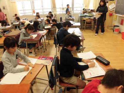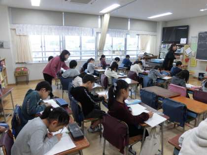 13日(木)の1時間目、2年3組は書き初めに取り組んでいました。お手本に登場する漢字をみんなで見付け、国語のノートに書いて練習しました。
