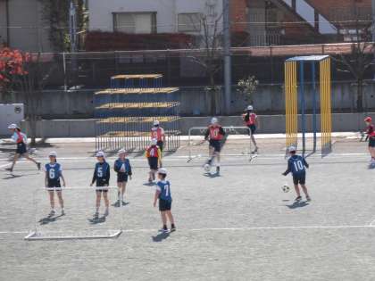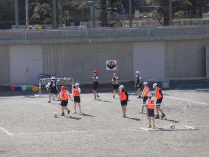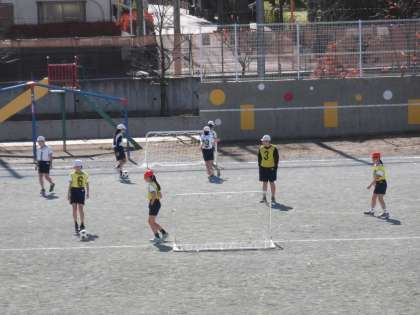 14日(金)の4時間目、6年3組は体育の時間でした。校庭で「サッカー」に取り組んでいました。チームごとに練習をしてからゲームに臨みました。写真はチームでの練習の様子です。