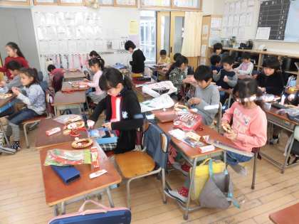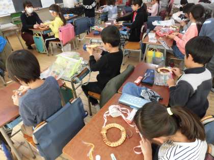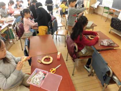14日(金)の5時間目、2年1組は図画工作の時間でした。「パンリース」作りに挑戦していました。パン作りの得意な先生が、2年生全員分のパンを焼いて準備をしてくださいました。子どもたちは思い思いの飾りを付けて楽しんでいました。