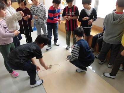 17日(月)の3時間目、2年3組は生活科の時間でした。昔遊びをしていました。こま回しと剣玉のグループに分かれて、時間で交代しながら練習をしました。やり方を教え合いながら練習をしていました。2年生はやがて1年生に遊び方を教えるのだそうです。