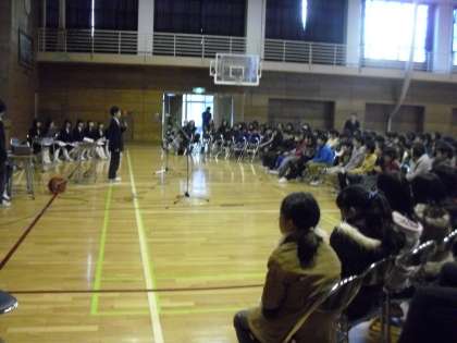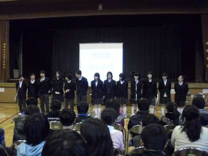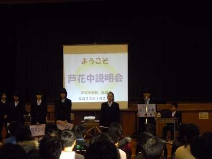 放課後、6年生が参加した芦花中学校説明会の様子です。芦花中学校の先生と生徒が来年度入学する6年生に芦花中学校の生活について説明しているところです。芦花小学校の6年生だけでなく、千歳台小や八幡山小の6年生も数名参加しました。中学生は、芦花中の特色等をクイズ形式などで楽しく6年生に伝えていました。