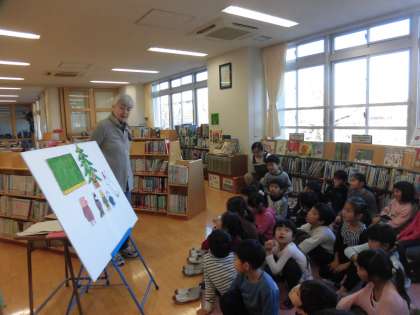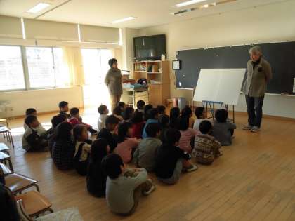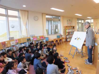 18日(火)の午前中、1年生はパネルシアターに参加しました。区内在住の方が講師としてお越しくださいました。今回は「ぶたたぬききつねねこ」の本をもとに、しりとり遊びをしました。リンゴ、ゴリラ、ラッパときたら次は?パイナップルと思いきや、子どもたちは「パンツ」と答えました。講師の先生曰く、最近は後者の方が多いそうです。写真は上から1組、2組、4組の様子です。