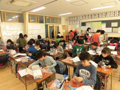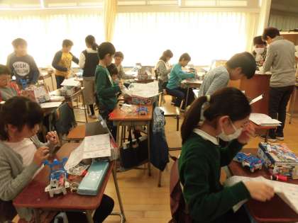 18日(火)の3・4時間目、5年4組は理科の時間でした。「電磁石」のまとめとして、各自でモーター付きの車を組み立てていました。説明書を読んだり、友達に聞いたりしながら、自分だけの車を完成させていました。廊下に出て早速走らせていました。