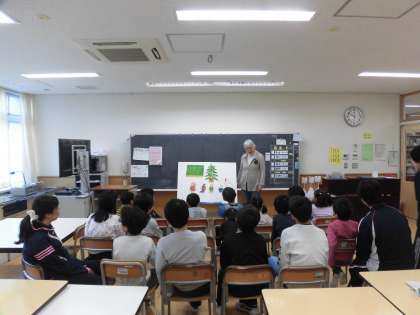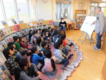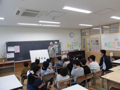19日(水)も区内在住の方にお越しいただき、パネルシアターをしていただきました。今回は、1時間目に1年5組、2時間目にひかり学級の子どもたちが参加してなぞなぞを楽しみました。