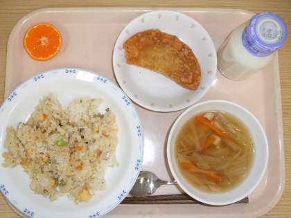 今日は大人気のメニュー「ジャンボぎょうざ」でした。ひとつひとつ給食室で包み、きつね色に揚げました。大きなぎょうざは、皮がカリカリでおなかいっぱいになりました。