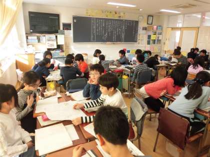 20日(木)の1時間目、4年4組は国語の時間でした。教材名「新聞のくふうを知ろう」の学習をしていました。グループを作り、持ち寄った新聞を見ながら新聞の工夫について話し合ったり、これまでに自分が書いた新聞の改善点を見付けたりしました。子どもたちは活発に意見を述べていました。