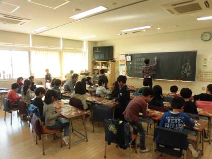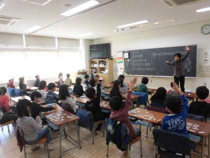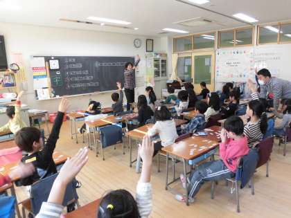 20日(木)の3時間目、1年5組は算数の時間でした。繰り下がりのあるひき算カードを使って、計算練習をしていました。担任の先生と講師の先生とで子どもたちを見守ります。答えが3になるカード、4になるカードと次々に問題が登場しますが、子どもたちは「あった!」「見付けた!」と言いながら楽しんで探していました。