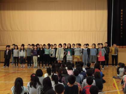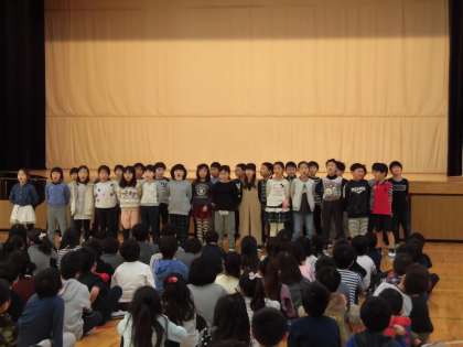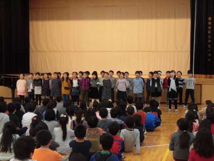 歌の発表は伴奏なしのアカペラでした。音楽の先生が最初の音をとっただけで、歌が始まりました。先生の指揮を見ながら、伸ばすところや切るところの区別がしっかりとできました。3組は「もみじ」、4組は「夕焼け小焼け」、5組は「もみじ」を歌いました。2年生の子どもたちにとって、みんなの前で歌うことはよい経験になりました。