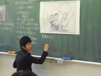 4年生の道徳の授業の様子です。このクラスは、エスカレーターの真ん中険しい表情で昇る若者と驚いたようなおじいさんと孫の表情が画かれた一枚の絵を提示し、礼祇について考えました。いろいろな状況を想定し、意見を交換します。