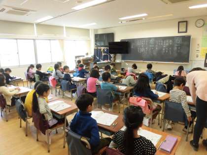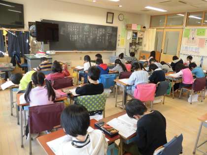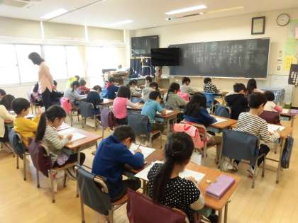 9日(水)の1時間目、1年4組は国語の時間でした。新しい漢字の学習をしていました。今回は「右」と「左」。書き順やことば探しをしてから、ノートに書いて練習をしました。終わった人は鉛筆を置き、背筋を伸ばして先生が来るのを静かに待つことができました。