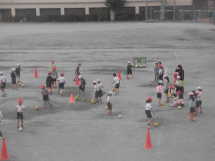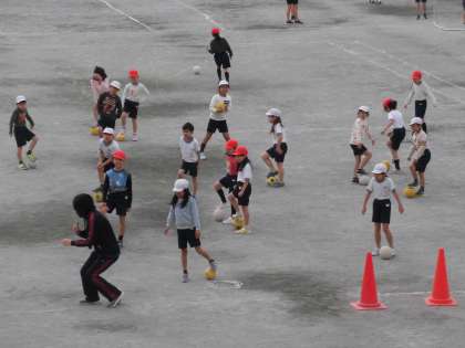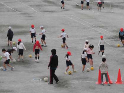 10日(木)の3時間目、3年1組は体育の時間でした。校庭で「サッカー」の1回目に取り組んでいました。一人1個ボールを使いながら、蹴ったり足で押さえたりしました。これから練習を重ねてボール操作に慣れるようにしていきます。