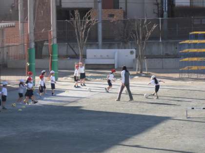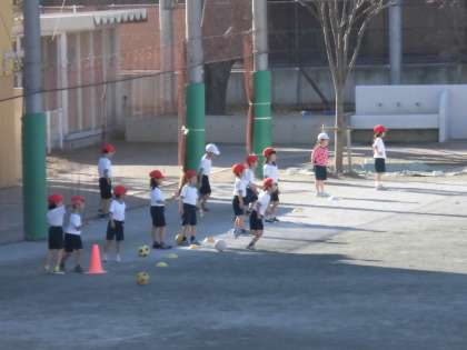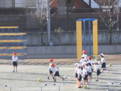 11日(金)の1時間目、1年3組は体育の時間でした。校庭でボール蹴りあそびに挑戦していました。向こう側にいる相手にボールを蹴って届けることをしました。強く蹴ったり、少しずつ蹴ったりする姿がありました。