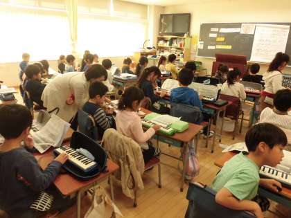 11日(金)の5時間目、2年1組は音楽の時間でした。「ずいずいずっころばし」を歌いながら、遊びました。「お茶碗かいたのだあれ」と歌い終えるとあちらこちらから「やったあ」「やられたあ」と元気な声が聞かれました。「家でもやってみよう。」と言う声もありました。次に、けんばんハーモニカを出し、2年生が大好きな歌「リジョイス」の練習をしました。