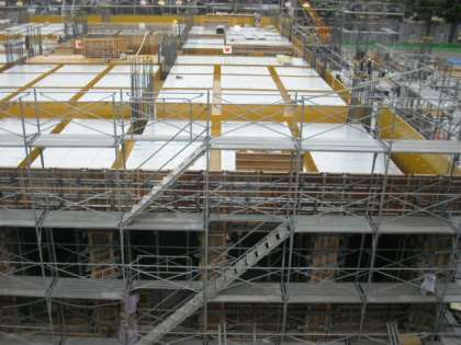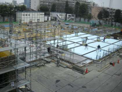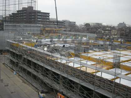 今日は、土曜日の道徳授業地区公開講座の振替休日ですが、工事は通常通り行われています。テニスコートの裏側は3階の足場が立ち始めました。2階部分も半分以上進みました。着々と新校舎の建設が進んでいます。