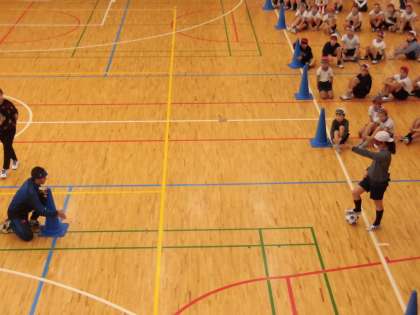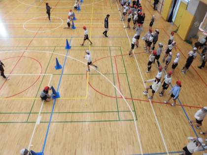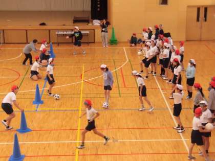 ブラインドサッカーでは、アイマスクを付けます。子どもたちはボールを蹴るときにアイマスクを付けました。音のするボールと案内する友達の声を頼りに、3m先の三角コーン目がけてボールを蹴りました。案内役も「こっち」では伝わらす「右だよ」「もう少し左」と指示してこそ相手に伝わるんだと実感していました。5年生にとって学びの多い時間となりました。