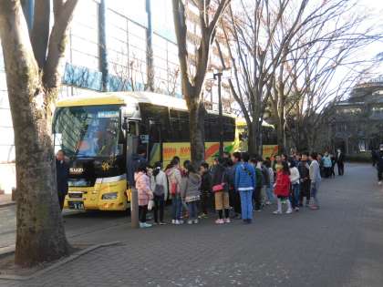 18日(金)、4年生は美術鑑賞教室に向かうため、1階のピロティに集合し出発式を行いました。その後4台のバスに乗り込みました。午前9時5分に目的地に向けてバスが動き出しました。