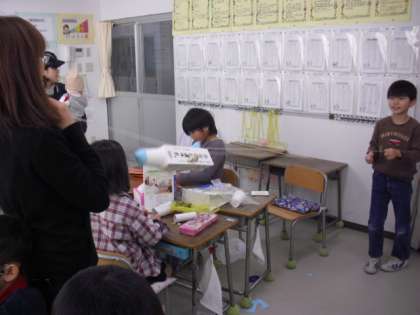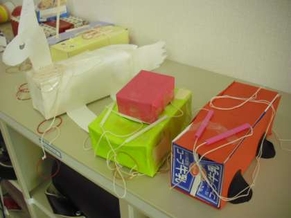 2年生の図画工作科の授業の様子です。2本の糸でスイスイ動く乗り物を作っているところです。牛乳パック等をボディにし、ストローと糸を使って動くしかけを作ります。田二人組になり、糸を操作すると作品がスイスイと動き出すと子どもたちも喜んでいました。