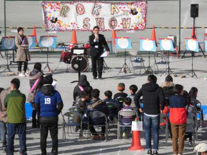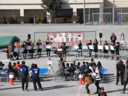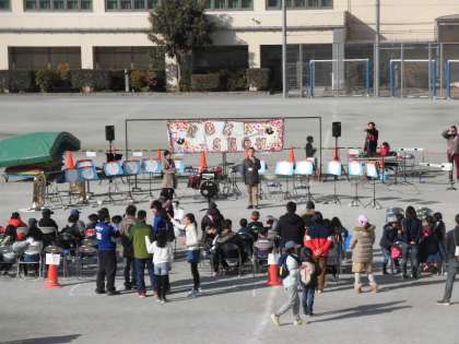 20日(日)、PTA主催による「新年親子お楽しみ会」が開催されました。午前9時50分に開会式をしました。PTA会長さんのあいさつ、校長先生のあいさつなどがあり、10時からお楽しみ会が始まりました。都立芦花高校吹奏楽部の有志の皆さんによる演奏で幕を開けました。