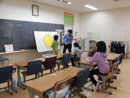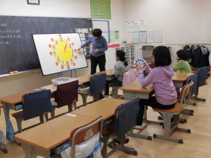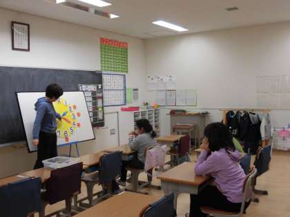 22日(火)の4時間目、ひかり学級では算数の授業でした。5グループに分かれて学習をしていました。ひかり学級2組の教室では、「とけい」の読み方を学習しました。時計の文字盤の確認や短針と長針の読み方の練習を繰り返し行いました。ゆっくり取り組むことで「わかった」「できた」と自信をつけました。