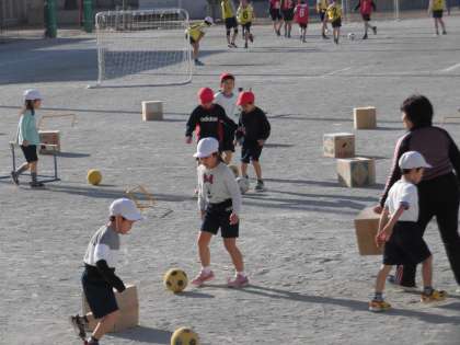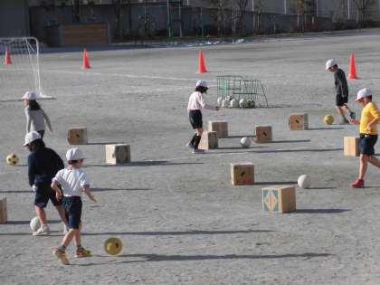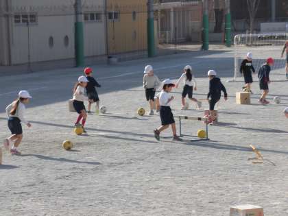 23日(水)の1時間目、1年2組は体育の時間でした。校庭で「ボール蹴りあそび」をしていました。ボールを足で操りながら目標物の箱に当てたり、ハードルの中をくぐらせたりしました。