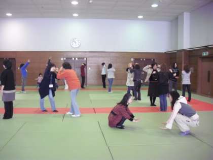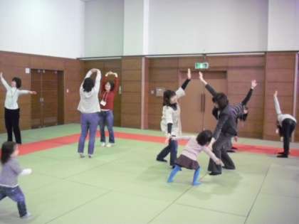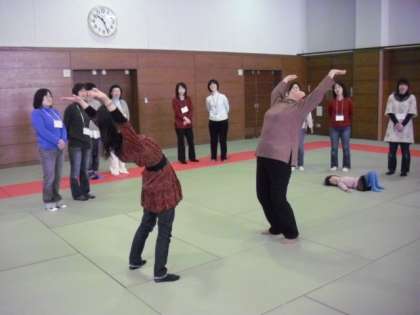 二人組の組み合わせを変えて「人間と鏡」という二人組のワークを行っている様子です。一人が人間役となり、鏡役の人は鏡に映る人間の動きを真似ます。参加者の表情も実に穏やかで楽しそうにやっています。これもドラマケーションのポイントです。