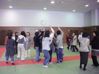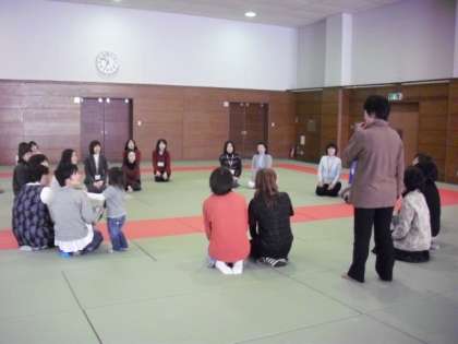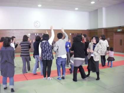 仲間集めのワークの様子です。1回目のテーマは「自分が好きな色」です。好きな色を決めて言葉で発信します。「ピンク〜!」「きいろ〜!」自分と同じ色の仲間を見つけて座ります。2回目のテーマは「自分の好きな寿司ネタ」です。「イクラ〜イクラ〜」「エビ〜エビ〜」「トロ〜トロ〜」等と叫びながら仲間を探します。仲間が見つからなかった人もいますが、一人ではなく必ずどこかに仲間がいるというのがドラマケーションの考え方です。