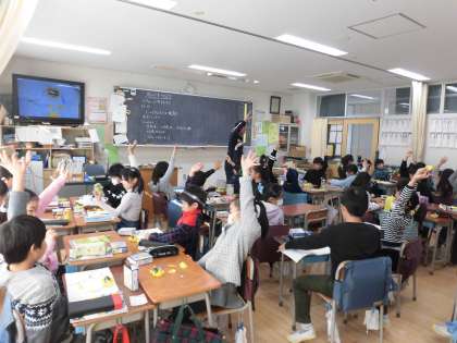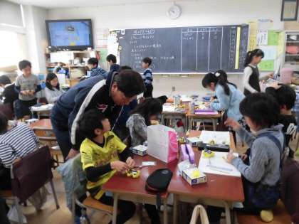 24日(木)の2時間目、3年5組は理科の時間でした。単元名「明かりをつけよう」の中の「電気を通すものさがし」をしていました。テスターを作ってから、教室内にあるもので電気を通すかどうかを実験しました。豆電球の明かりがつくと「ついた」と喜んでいました。