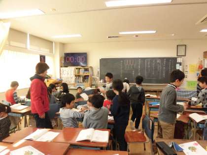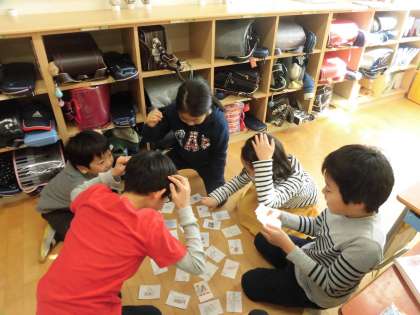 24日(木)の5時間目、3年3組は国語の時間でした。「カルタをつくろう」の学習に取り組んでいました。6つのグループに分かれて、読み札と取り札作りをしています。両方が完成したグループが早速遊び始めました。他グループももうすぐ完成です。