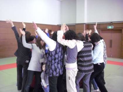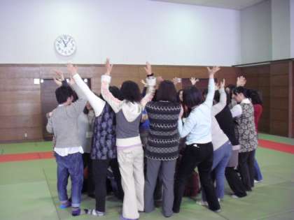 集団による人間オブジェのワークの様子です。全体を2グループに分けます。テーマに沿って動きで表現します。ただし、自分の体のどこかが仲間に触れていることが条件です。最初のテーマは「花」です。まずは2グループ合同で行います。