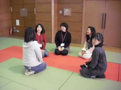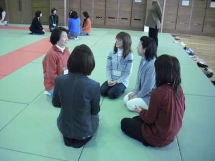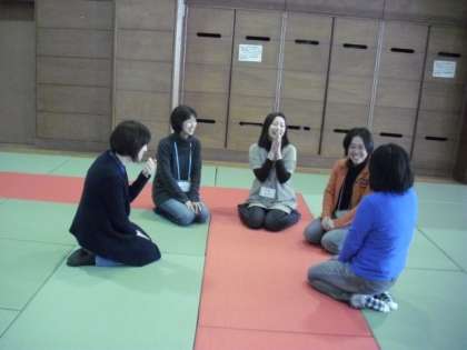 相手のよいところをほめる「女王様」ゲームの様子です。グループの一人が女王様になります。他の人は順番に女王様のことを褒めます。みなさん女王様気分を楽しんでいました。褒められる、認められることは人のつながりの中でもポイントです。