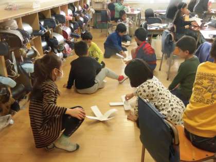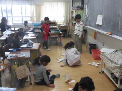 25日(金)の5時間目、2年2組は国語の時間でした。単元名「読んで、作って、あそぼう」から紙パックを使ってこまを作っていました。今回は、「軸」の付け方を読み取ってから、実際に作りました。作り終えた子から床で回してみました。「回った!」と喜ぶ子どもたちの姿がありました。