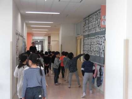 12日(土)から始まった校内書き初め展が25日(金)で終了となりました。保護者の皆様には学校公開期間を通してご覧いただきました。子どもたちは休み時間に見たり、クラスごとに鑑賞したりしました。写真は、25日の5時間目、1年5組の子どもたちが鑑賞をしているところです。