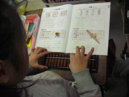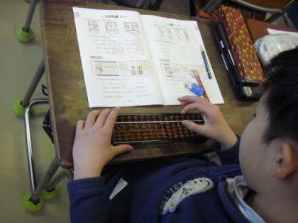 3年生の算数の授業の様子です。全国珠算教育連盟から講師の先生をお招きし、そろばんの学習をしているところです。今日で3回目です。そろばんをはじくことにも少しずつ慣れてきました。計算の練習をがんばっていました。
