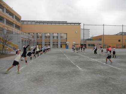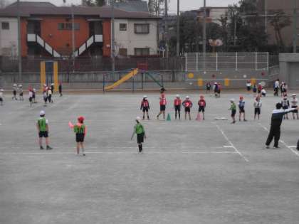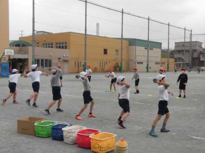 31日(木)の1時間目、4年3組は体育の時間でした。始まりのあいさつや準備運動のかけ声が寒さを吹き飛ばすほどの元気よさでした。ボール運動の中のベースボール型「バックホームゲーム」に取り組んでいました。ゲームの前にボールを投げてキャッチする練習をしました。ペア同士が上手にキャッチできると互いの距離を離していきます。少しずつ遠くへも投げられるようになっていました。ゲームもチームワークよくできました。