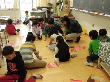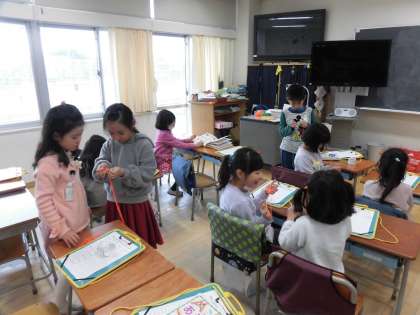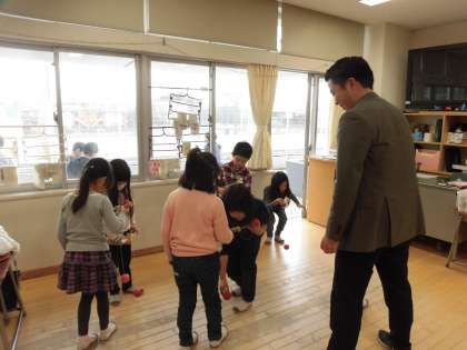 31日(木)の5時間目、1年生は合同で生活科の時間でした。昔遊びの練習を5クラスに分かれて行いました。遊びごとに分かれるのでクラスに関係なく、教え合う姿がありました。写真は上から、だるま落とし、あやとり、けん玉を練習している様子です。