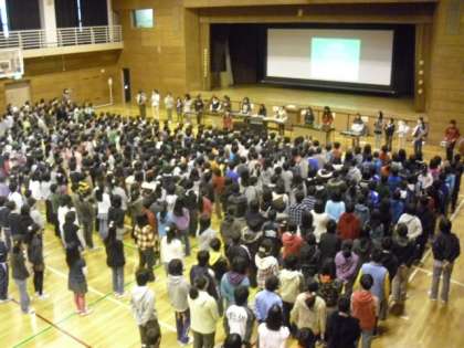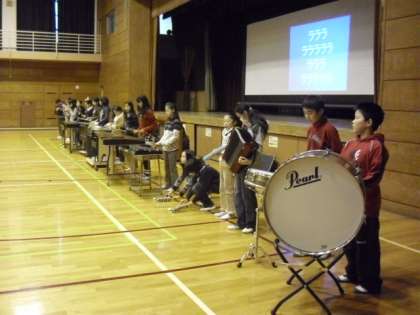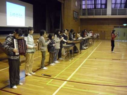 今朝の音楽朝会の様子です。今回の歌はブルガリアの民謡「ふゆのうた」です。器楽委員会の演奏に合わせて元気よく歌いました。歌詞の中の「ズンズン」は何の音?というクイズがありました。正解は「鈴の音」でした。