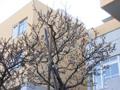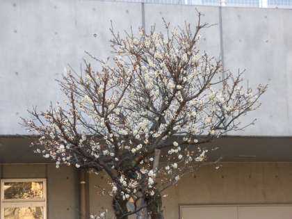 校舎北側の庭園には梅の木が2本あります。寒さの中でも1月下旬から白い花をつけ始めました。写真は2月1日(金)の様子です。今年の夏以降、校舎増築工事が始まるため、この白梅が見られるのは今だけです。ご来校の折りにご覧ください。
