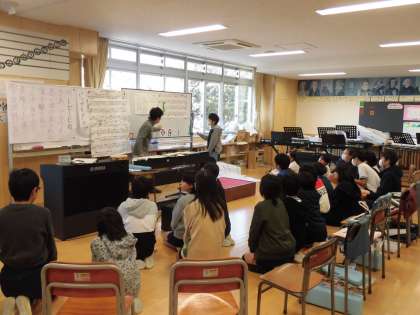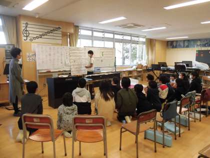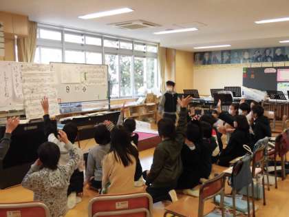 2月1日(金)の3時間目、6年4組は音楽の時間でした。合奏曲「ルパン3世」の楽譜の確認をしていました。音楽の先生から指名された一人が前に出て指し棒で演奏順序を発表しました。ダルセーニョ、コーダなどの記号を確認しました。