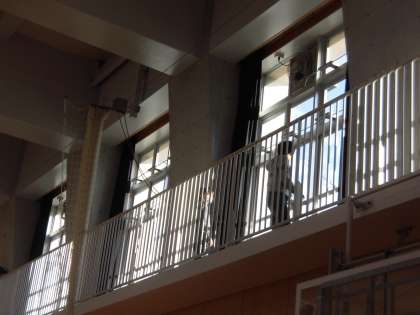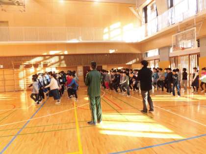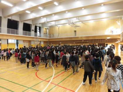 全校朝会が終わると音楽に合わせて行進をします。退場の順番が来るまではその場で行進をして待ちます。また、6年生は2階に上がり遮光カーテンを束ねています。全校の子どもたちが気持ちよく生活できるように支えている姿が素晴らしいです。