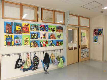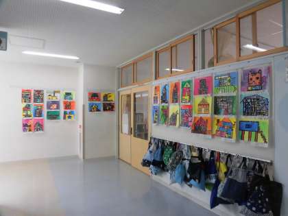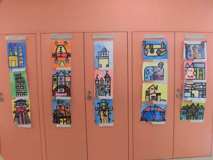 2年生の廊下には図画工作の時間に取り組んできた「ガムテープの建築家」の作品が掲示されています。黒いガムテープが建物の骨格をしっかりと表しています。絵の具の色使いもすてきです。