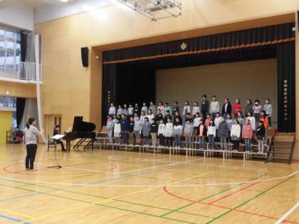 9日(土)、いつも以上に張り切って合唱団の子どもたちが第一音楽室に集まりました。中休みに行うミニコンサートに向けての最終練習だからです。音楽室で声出しをしてから体育館に向かいました。今回は、「愉快に歩けば」を歌いながらステージに向かうという演出を考えています。曲目紹介は今回も6年生が行いますが、その練習もしました。本番が楽しみです。