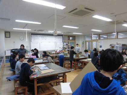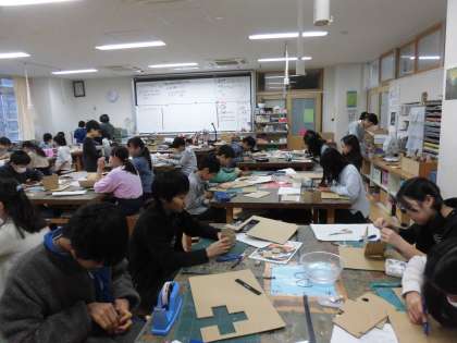 9日(土)の1・2時間目、5年2組は図画工作の時間でした。段ボールの良さを生かして形や色を組み合わせた作品つくりに取り組んでいました。四角形に切って重ねたり、箱形にしたりしているうちにアイディアが浮かんできたようです。