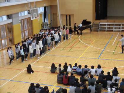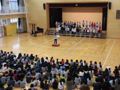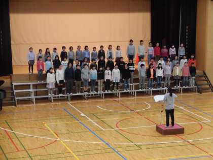 9日(土)の中休み、体育館で合唱団のミニコンサートが行われました。今回も子どもたちや保護者の方がたくさん聴きに来てくださいました。「愉快に歩けば」「山の朝」「WISH]「すてきな友達」の4曲を披露しました。6年生の曲目紹介も上手にできました。