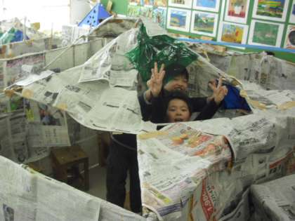自分たちの作った「新聞紙のかくれが」の中に入って喜ぶ子どもたちの様子です。つかの間の生活を楽しんでいます。給食も「かくれが」の中でいただきました。