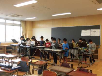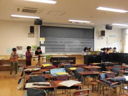 14日(木)の2時間目、3年4組は音楽の時間でした。「パフ」の曲をみんなで合奏していました。担当する楽器の練習をしてから、4小節ずつ合わせていきました。授業の最後には12小節まで合わせることができました。