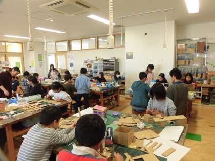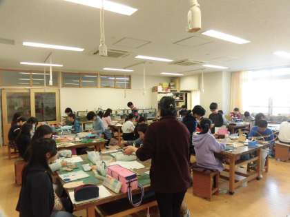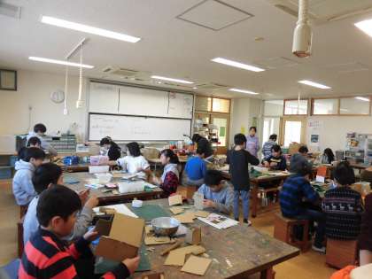 18日(月)の3・4時間目、5年2組は図画工作の時間でした。段ボールを使って作品作りに取り組んでいました。パーツを切って、ボンド等で貼り付け、アクリル絵の具で色を付けます。子どもたちは、自分の思い描く世界をのびのびと表現していました。