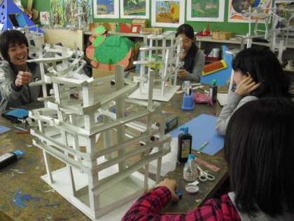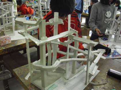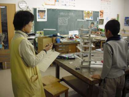 5年生の授業の様子です。ビー玉迷路もいよいよ完成に近付いてきました。「ビー玉が長い時間転がるように」のテーマのもと、傾斜角度を考えながら創意工夫した迷路が出来上がってきました。大坂先生が時間を計っています。何秒だったのかな。