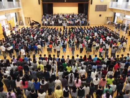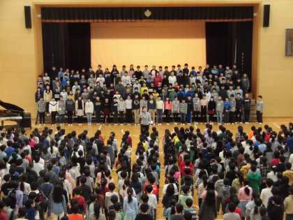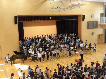 22日(金)の朝は、体育館で音楽朝会をしました。6年生を送る会で歌う「すてきな友達」の練習をしました。今回も6年生がひな壇に並び、歌い方の手本を示していました。音をつなげて歌えるように練習をして、最後に全員で歌いました。器楽委員の5・6年生が演奏する中、行進をして教室に戻りました。